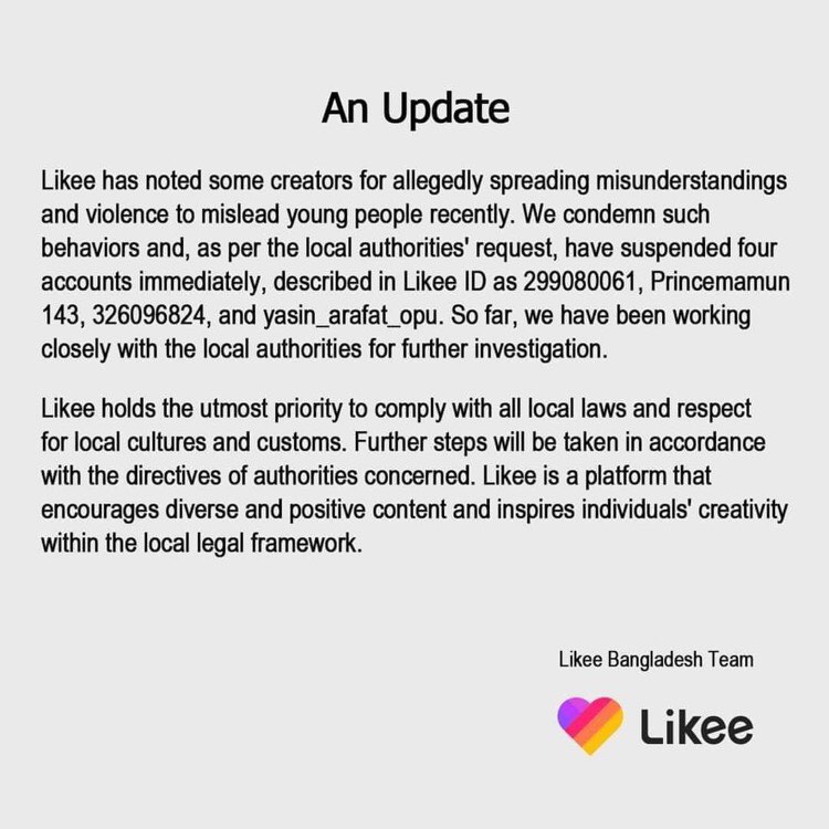 বিনোদন ডেস্ক : বিতর্কের মুখে টিকটক অপুর লাইকি অ্যাকাউন্ট ব্যান করে দিল লাইকি কর্তৃপক্ষ। আজ এক বিজ্ঞপ্তির মাধ্যমে এমন ঘোষণা দেয় লাইকি বাংলাদেশ।