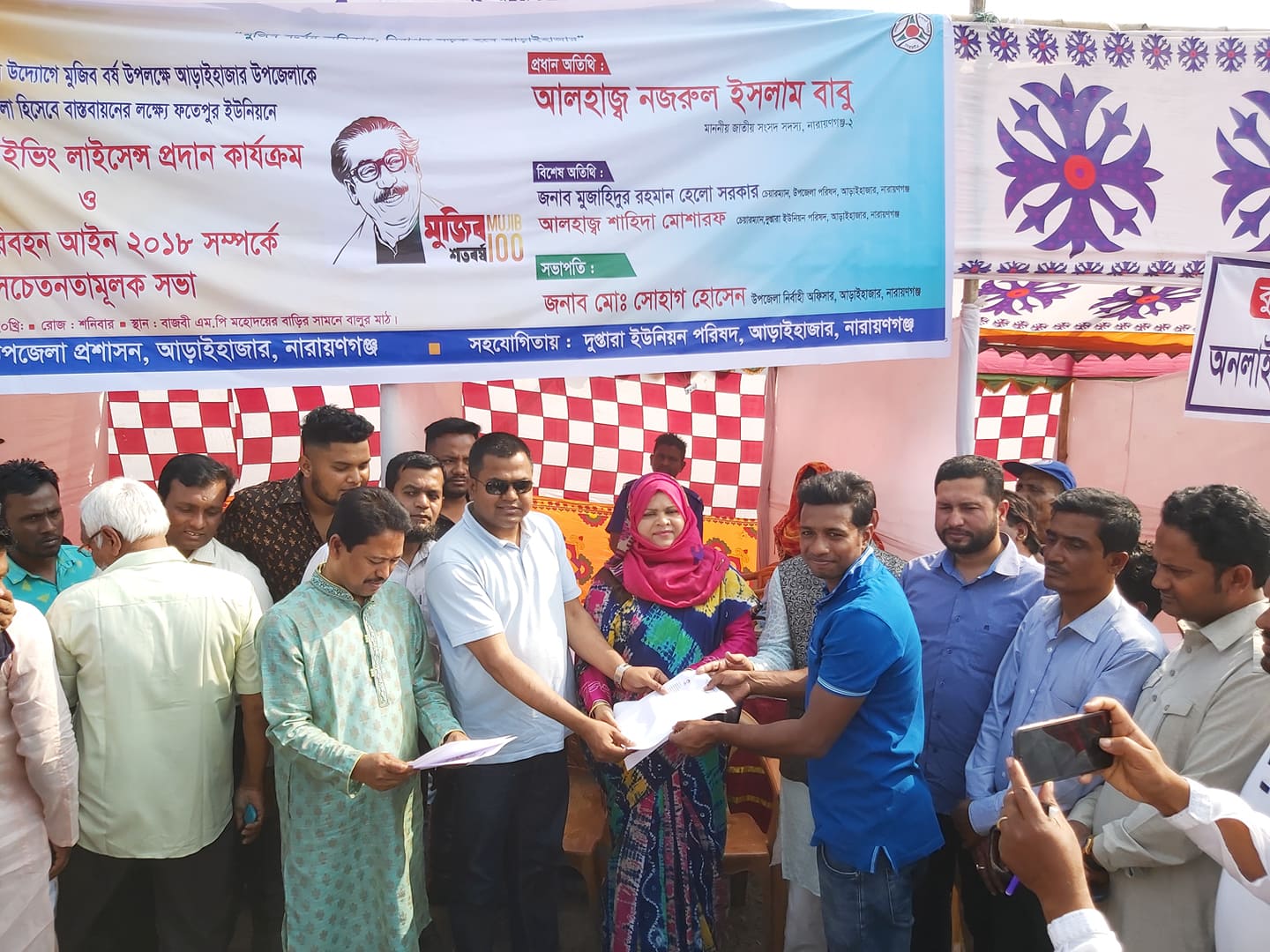 আড়াইহাজার (নারায়ণগঞ্জ) প্রতিনিধি : নারয়ণগঞ্জের আড়াইহাজারে শিক্ষানবীশ ড্রাইভিং লাইসেন্স পেল ৩ শতাধিক চালক। এই উপলক্ষে শনিবার দিনব্যাপী উপজেলা প্রশাসনের উদ্যেগে ও আড়াইহাজারের দুপ্তারা ইউনিয়ন পরিষদের সহযোগিতায় শিক্ষানবীশ ড্রাইভিং লাইসেন্স প্রদান কার্যক্রম ও সড়ক পরিবহন আইন, ২০১৮ সম্পর্কে সচেতনতামূলক সভা অনুষ্ঠিত হয়।