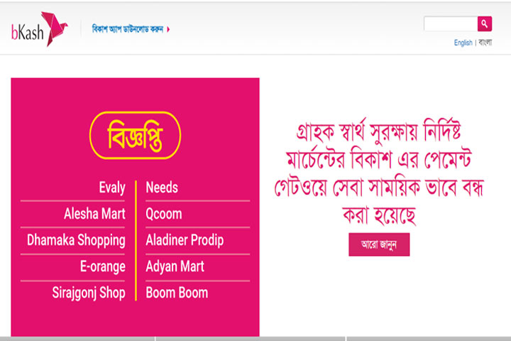 বিজ্ঞপ্তিতে বলা হয়, ইভ্যালি ছাড়াও আলিশা মার্ট, ধামাকা শপিং, ই-অরেঞ্জ, সিরাজগঞ্জ শপ, আলাদীনের প্রদীপ, কিউকুম, বুম বুম, আদিয়ান মার্ট ও নিডস এর সঙ্গে বিকাশের পেমেন্ট গেটওয়ে সেবা সাময়িকভাবে বন্ধ করা হয়েছে।