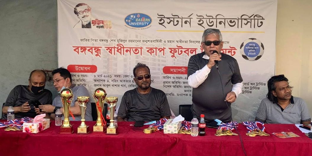 জুমবাংলা ডেস্ক: বাংলাদেশের স্বাধীনতার সুবর্ণজয়ন্তী ও বঙ্গবন্ধুর জন্মশতবার্ষিকী উপলক্ষে ইস্টার্ন ইউনিভার্সিটিতে ‘বঙ্গবন্ধু স্বাধীনতা কাপ ফুটবল টুর্নামেন্ট ২০২১’ অনুষ্ঠিত হয়েছে।