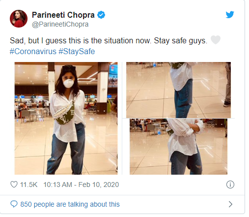 সোমবার টুইটারে একটি পোস্ট দিয়েছেন পরিণীতি। পোস্টে দেখা যাচ্ছে তাঁরসাদা মাস্কে ঢাকা মুখ। ক্যাজুয়াল শার্ট আর নীল ডেনিমে পরিণীতি ক্যাপশনে লিখেছেন,“স্যাড, কিন্তু বর্তমান পরিস্থিতি এমনটাই।” করোনাভাইরাসের ভয়াবহতা সম্পর্কে অনুরাগীদের সতর্ক করতেই ওই পোস্ট করেছিলেন অভিনেত্রী।