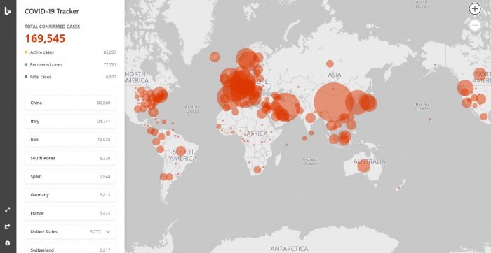 বিজ্ঞান ও প্রযুক্তি ডেস্ক : সার্চ ইঞ্জিন বিং এর ব্যবহারকারীদের জন্য করোনা ভাইরাসের লাইভ আপডেট নিয়ে এলো মাইক্রোসফট। যেখানে একটি ম্যাপে করোনায় আক্রান্ত ব্যক্তি ও দেশসমূহের তথ্য তুলে ধরা হচ্ছে।