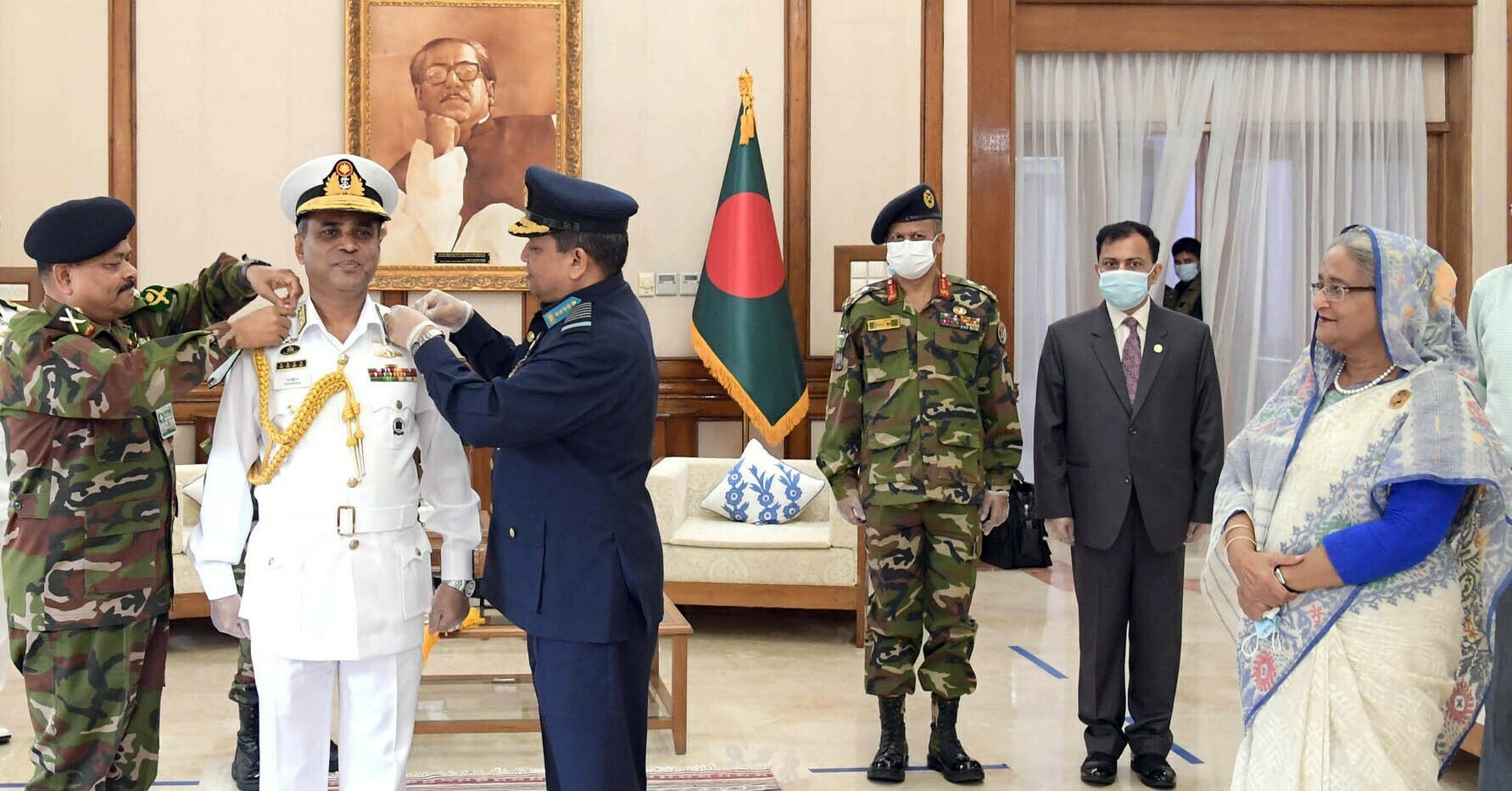 প্রধানমন্ত্রীর প্রেস সচিব ইহসানুল করিম জানান, ‘সেনাবাহিনী প্রধান জেনারেল আজিজ আহমেদ এবং বিমান বাহিনী প্রধান এয়ার চিফ মার্শাল মাসিহুজ্জামান সেরনিয়াবাত নতুন নৌ-প্রধানকে ভাইস-অ্যাডমিরালের র্যাঙ্ক ব্যাজ পরিয়ে দেন।’