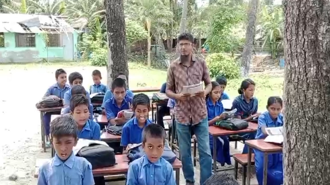 জুমবাংলা ডেস্ক : ঘূর্ণিঝড় রেমালের তাণ্ডবে সাতক্ষীরার আশাশুনির বৈকরঝুটি সরকারি প্রাথমিক বিদ্যালয়ের ক্লাসরুমের টিনের ছাউনি উড়ে যাওয়ায় খোলা আকাশের নিচে গাছতলায় ক্লাস করতে হচ্ছে তৃতীয় শ্রেণির ৬১ জন শিক্ষার্থীকে। তীব্র রোদে গরমে ও বৃষ্টিতে অনেক সময় ক্লাস বন্ধ রাখা হয়। তবে বেশিভাগ সময় এভাবে কোমলমতি শিশুদের পাঠদান চলে বলে জানান সংশ্লিষ্টরা।