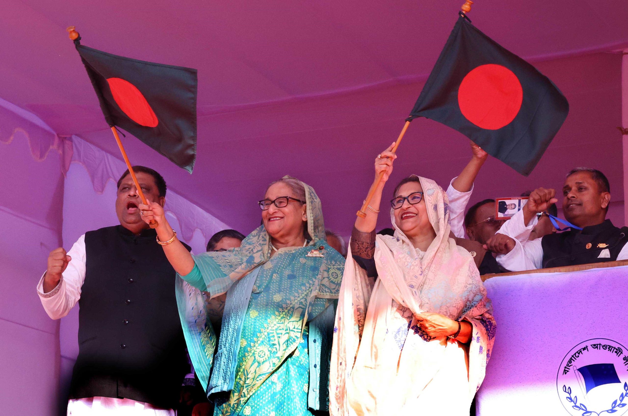 ছোট বোন শেখ রেহানাকে নিয়ে জনসভা মঞ্চে আসেন আওয়ামী লীগ প্রধান শেখ হাসিনা। সভা মঞ্চে এসে নেতাকর্মীদের উদ্দেশ্যে জাতীয় পতাকা নেড়ে শুভেচ্ছা জানান শেখ হাসিনা এবং শেখ রেহানা। জনগণও শ্লোগানে শ্লোগানে চারদিক মুখরিত করে ব্যানার, ফেস্টুন ও পতাকা নেড়ে প্রতিউত্তর দেয়।