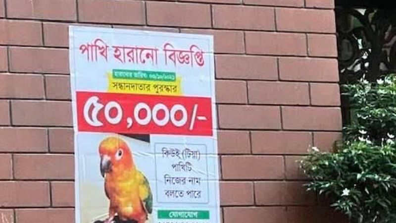 জুমবাংলা ডেস্ক: ঢাকার গুলশান এলাকার দেয়ালে দেয়ালে একটা পোষ্টার অনেকের নজর কেড়েছে। পোষ্টারে একটা পাখির ছবি। ‘পাখি হারানো বিজ্ঞপ্তি’ শিরোনামের এই পোস্টারে উল্লেখ করা হয়, সন্ধানদাতাকে ৫০ হাজার টাকা পুরস্কার দেয়া হবে। খবর বিবিসি বাংলার।