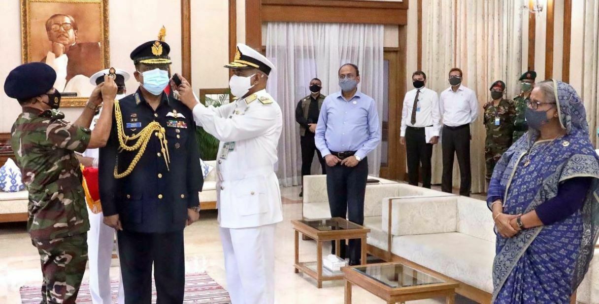 প্রধানমন্ত্রীর সহকারি প্রেস সচিব এম এম ইমরুল কায়েস আজ জাতীয় বার্তা সংস্থাটিকে বলেন, ‘চিফ অব আর্মি স্টাফ জেনারেল এস এম শফিউদ্দিন আহমেদ এবং ভারপ্রাপ্ত চিফ অব নেভাল স্টাফ রিয়ার অ্যাডমিরাল এম আবু আশরাফ এয়ার চিফকে এই এয়ার চিফ মার্শালের র্যাঙ্ক ব্যাজ পরিয়ে দেন।’