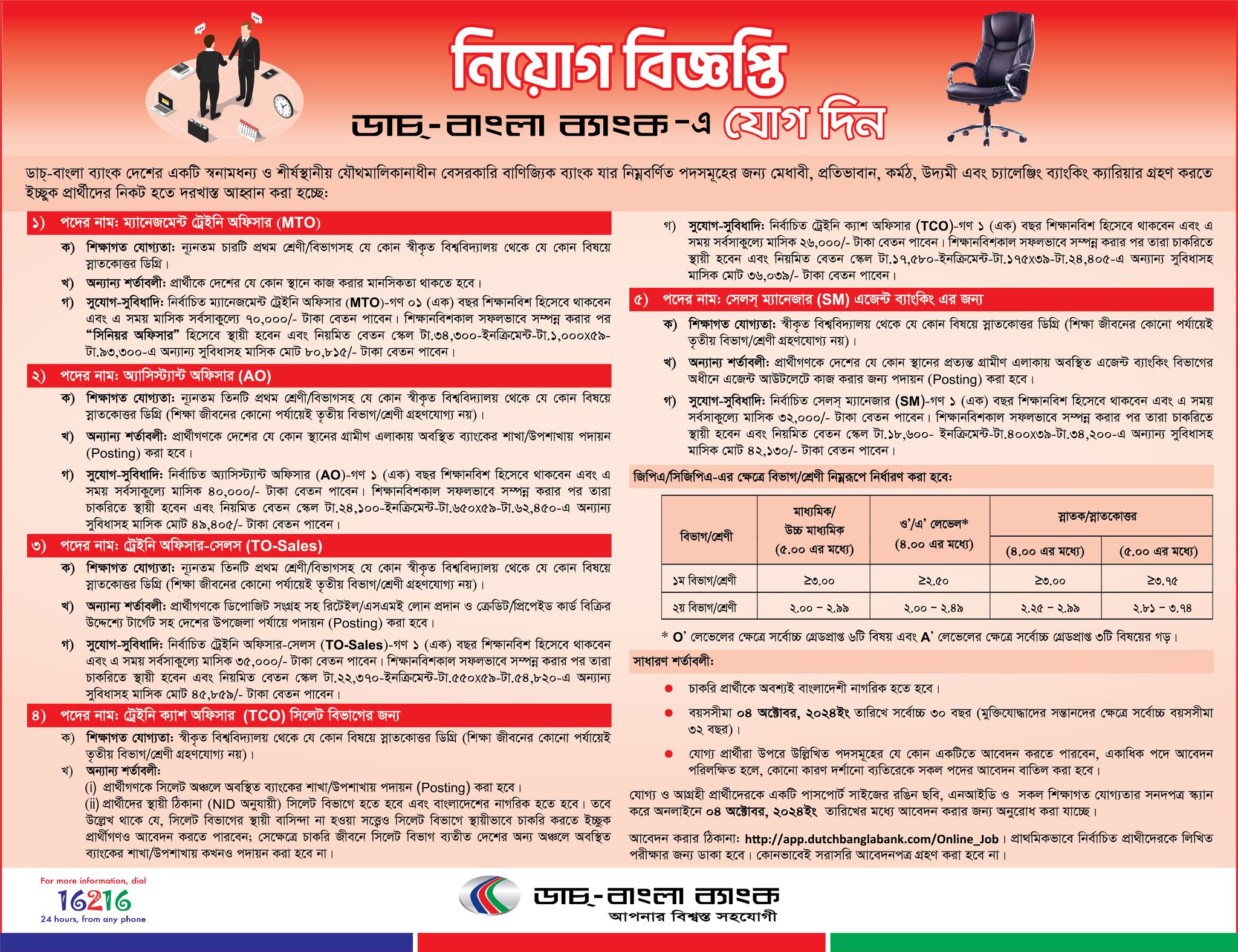 জুমবাংলা ডেস্ক : দেশের শীর্ষস্থানীয় যৌথমালিকানাধীন বেসরকারী বাণিজ্যিক ব্যাংক ডাচ্-বাংলা ব্যাংক নিয়োগ বিজ্ঞপ্তি প্রকাশ করেছে।