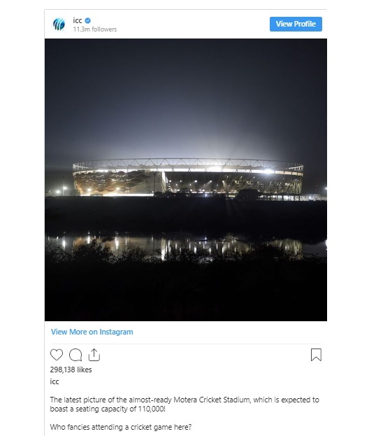 আইসিসি সেই ছবি পোস্ট করে লিখেছে, প্রায় তৈরি মোতেরা স্টেডিয়ামের লেটেস্ট ছবি। যেখানে প্রায় ১১০,০০০ লোকের বসার ব্যবস্থা রয়েছে। এখানে এবার ক্রিকেট ম্যাচ দেখবে কারা?