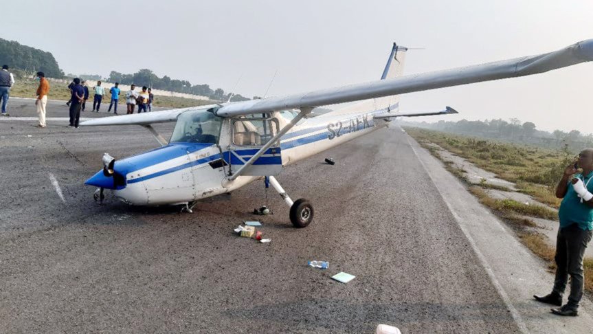 বিমানবন্দরের নিরাপত্তা সুপারভাইজার আবদুল মতিন বিষয়টি নিশ্চিত করে জানান, গ্যালাক্সি ফ্লাইং একাডেমির প্রশিক্ষণ বিমানটি (নম্বর এস২-এএফকেএন) উত্তর দিক থেকে অবতরণ করার সময় রানওয়ের মাঝামাঝি এলে বিমানটির পেছনের ডান পাশের একটি চাকা গোড়া থেকে ভেঙে যায়। বিমানটি পুনরায় আকাশে ওড়ার চেষ্টা করলে হুমড়ি খেয়ে সামনের বড় চাকাটি গোড়া থেকে ভেঙে রানওয়েতে মুথ থুবড়ে পড়ে।