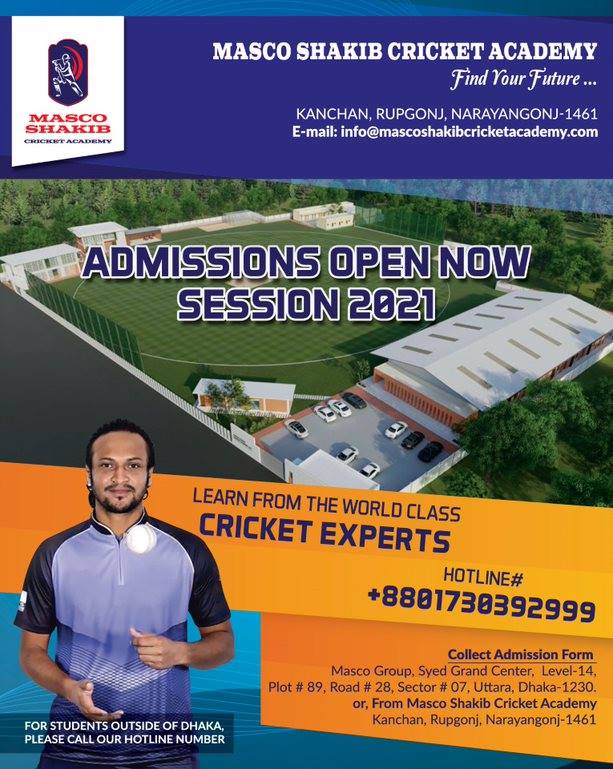 এরই মধ্যে ভর্তি ফরমও বিতরণ শুরু হয়েছে, যা চলবে ৩০ জানুয়ারি পর্যন্ত। ভর্তি ফরম সংগ্রহ করা যাবে বিনামূল্যে। ফরম পাওয়া যাবে মাসকো-সাকিব ক্রিকেট একাডেমি ও উত্তরার সাত নম্বর সেক্টরে অবস্থিত মাসকো গ্রুপের প্রধান কার্যালয়ে।