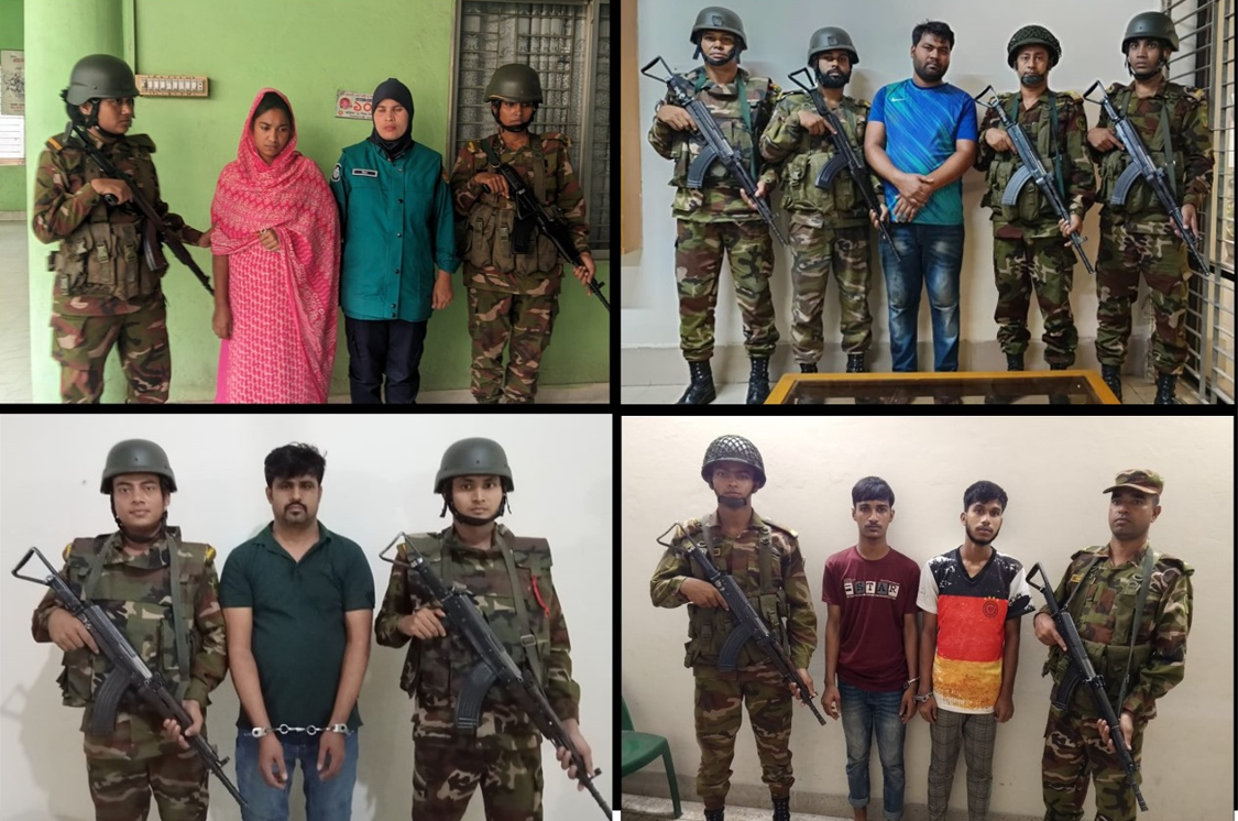 আইনশৃঙ্খলা বাহিনীর উপর আক্রমণ ও সরকারি সম্পত্তি ধ্বংসের পরিপ্রেক্ষিতে পরিচালিত যৌথ অভিযানের ধারাবাহিকতায় আজ (২ নভেম্বর) সেনাবাহিনী আলমগীর, রেশমা খাতুন, মাহফুয মিয়া, আমিনুল ইসলাম এবং কাজী রাসেলকে ভাষানটেক এবং কাফরুল এলাকা হতে আটক করে।