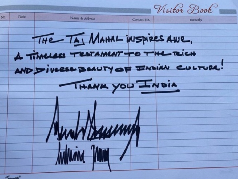 মার্কিন প্রেসিডেন্ট পরিদর্শন বইয়ে লেখেন: `Taj Mahal inspires awe, a timeless testament to the rich and diverse beauty of Indian culture! Thank you, India. ‘ নিচে সই করেন ট্রাম্প ও মেলানিয়া।