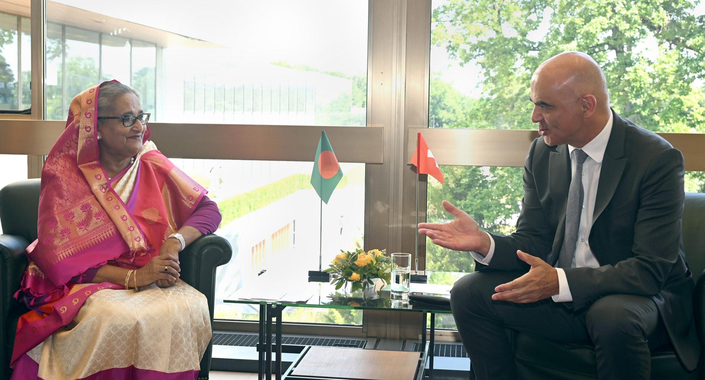প্যালেস দেস নেশনস এর দ্বিপাক্ষিক বৈঠক কক্ষে সুইস কনফেডারেশনের প্রেসিডেন্ট অ্যালাইন বারসেটের সঙ্গে সাক্ষাৎকালে বাংলাদেশের প্রধানমন্ত্রী এ আহ্বান জানান।