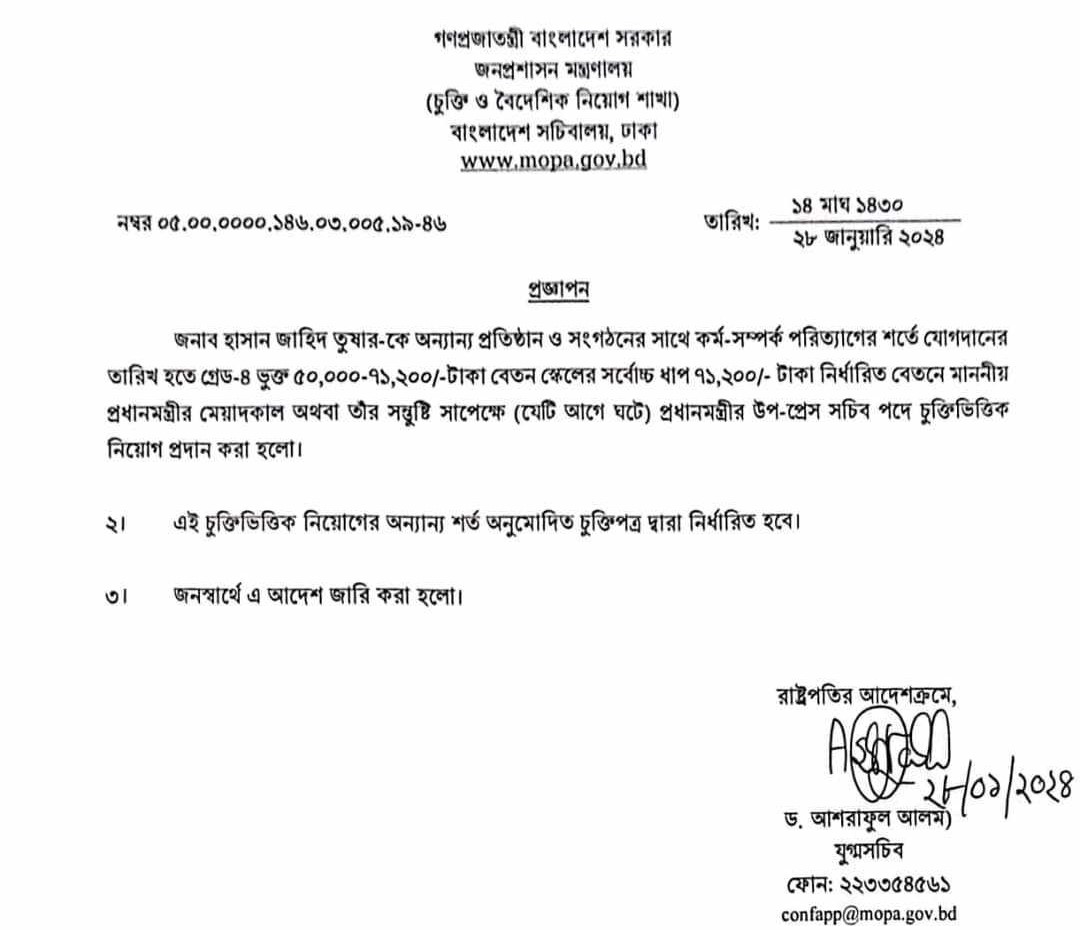 এর আগে ২০১৯ সালের শুরুর দিকে প্রধানমন্ত্রীর উপ-প্রেস সচিব পদে নিয়োগ পেয়েছিলেন মাগুরা জেলার কৃতি সন্তান হাসান জাহিদ তুষার।