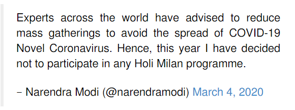 টুইট বার্তায় মোদি বলেন, বিশেষজ্ঞরা করোনা ভাইরাসের সংক্রমণ এড়াতে বড় কোন জন সমাগম এড়ানোর পরামর্শ দিয়েছেন, সেই পরামর্শ মেনেই এইবারের হোলি উৎসবে আমি না যাওয়ার সিদ্ধান্ত নিয়েছি।