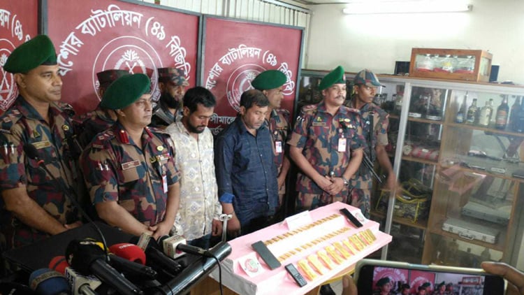 ব্রিফিংয়ে বিজিবি অধিনায়ক লে. কর্নেল আহমেদ হাসান জামিল বলেন, ‘গোপন সংবাদের ভিত্তিতে বিজিবি জানতে পারে সোনার একটি বড় চালান চৌগাছা সীমান্ত দিয়ে ভারতে পাচারের উদ্দেশ্যে প্রস্তত হচ্ছে। এরপর বিজিবির একটি বিশেষ দল চৌগাছা উপজেলার বড় আন্দুলিয়া গ্রামের রাস্তায় অবস্থান নেয়। সন্ধ্যা ৬টার দিকে মোটরসাইকেলযোগে সীমান্তের দিকে যাওয়া দুই ব্যক্তিকে গতিরোধের নির্দেশ দেয়া হয়। তারা দ্রুত পালিয়ে যাওয়ার চেষ্টাকালে টহলদল তাদেরকে ধাওয়া করে আটক করে। এরপর তাদের কাছে থাকা একটি ব্যাগের মধ্যে সাদা কাপড় ও স্কচ টেপ দ্বারা বিশেষ কায়দায় মোড়ানো অবস্থায় ৪৩টি সোনার বার উদ্ধার করা হয়। যার ওজন ১৩ কেজি ৪৬৪ গ্রাম। জব্দ সোনার মূল্য ১৩ কোটি ৪৬ লাখ ৪০ হাজার টাকা।’