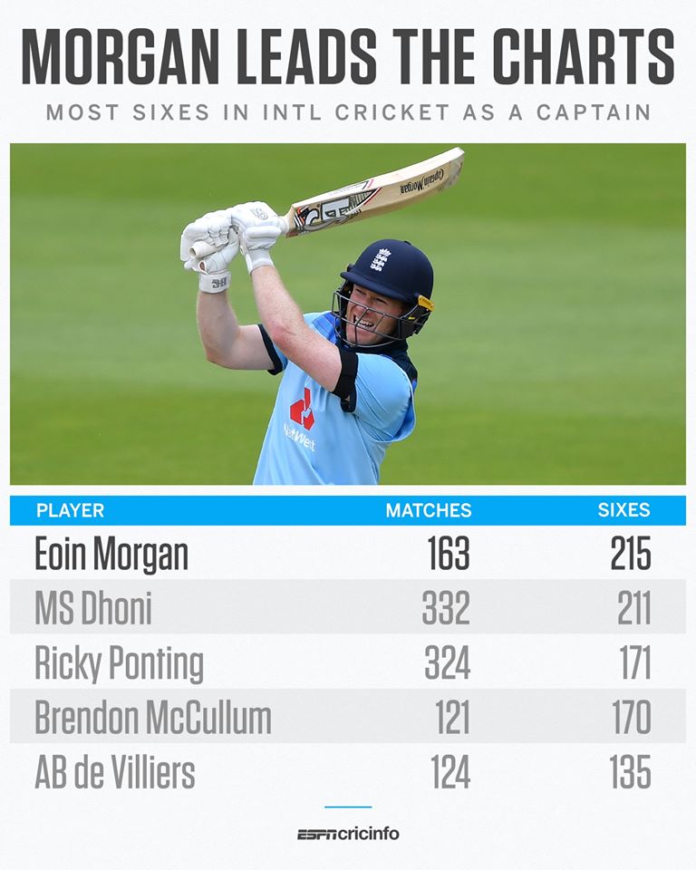 ১৬৩টি ম্যাচে নেতৃত্ব দেওয়া মরগান ছক্কা মেরেছেন ২১৫টি। আর দুই নম্বর স্থানে থাকা অধিনায়ক হিসেবে ধোনির ছক্কা ৩৩২ ম্যাচে ২১১টি।