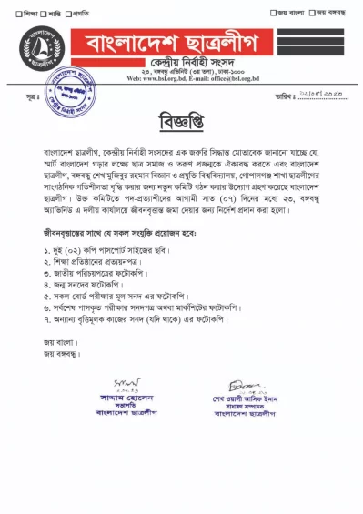 বিজ্ঞপ্তিতে বলা হয়, বাংলাদেশ ছাত্রলীগ, কেন্দ্রীয় নির্বাহী সংসদের জরুরি সিদ্ধান্ত অনুযায়ী জানানো যাচ্ছে যে, ‘বাংলাদেশ ছাত্রলীগ, কেন্দ্রীয় নির্বাহী সংসদ’ এর আকার অপরিবর্তিত রেখে নিম্নোক্ত সম্পাদকীয় পদগুলো সংযুক্ত করা হল: ১. অটিজম বিষয়ক সম্পাদক ২. মানবাধিকার বিষয়ক সম্পাদক ৩. মাদ্রাসা শিক্ষা বিষয়ক সম্পাদক ৪. কারিগরি শিক্ষা বিষয়ক সম্পাদক ৫. ছাত্রী ও নারী উন্নয়ন বিষয়ক সম্পাদক ৬. টেকসই উন্নয়ন লক্ষ্য (এসডিজি) বিষয়ক সম্পাদক ৭. উদ্যোক্তা ও উদ্ভাবন বিষয়ক সম্পাদক ৮. সামাজিক যোগাযোগমাধ্যম বিষয়ক সম্পাদক।