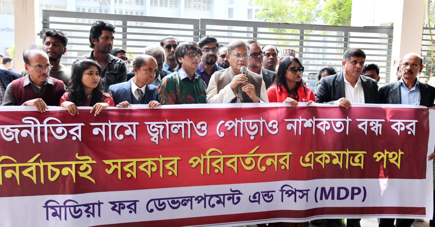 ‘মিডিয়া ফর ডিভালপমেন্ট এন্ড পিস’ সংগঠনের ব্যানারে ‘রাজনীতির নামে জ্বালাও-পোড়াও নাশকতা বন্ধ করো, নির্বাচনই সরকার পরিবর্তনের একমাত্র পথ’ শীর্ষক এ মানববন্ধনে জাতীয় প্রেসক্লাব সভাপতি ফরিদা ইয়াসমিনের নেতৃত্বে বাংলাদেশ সংবাদ সংস্থার ব্যবস্থাপনা পরিচালক আবুল কালাম আজাদ, সাংবাদিক কল্যাণ ট্রাস্টের ব্যবস্থাপনা পরিচালক সুভাষ চন্দ বাদল, ঢাকা সাংবাদিক ইউনিয়নের যুগ্ম সম্পাদক খায়রুল আলম, পত্রিকার সম্পাদকবৃন্দের মধ্যে হেমায়েত উদ্দীন, হেদায়েত উল্লাহ প্রমুখ অংশ নেন।