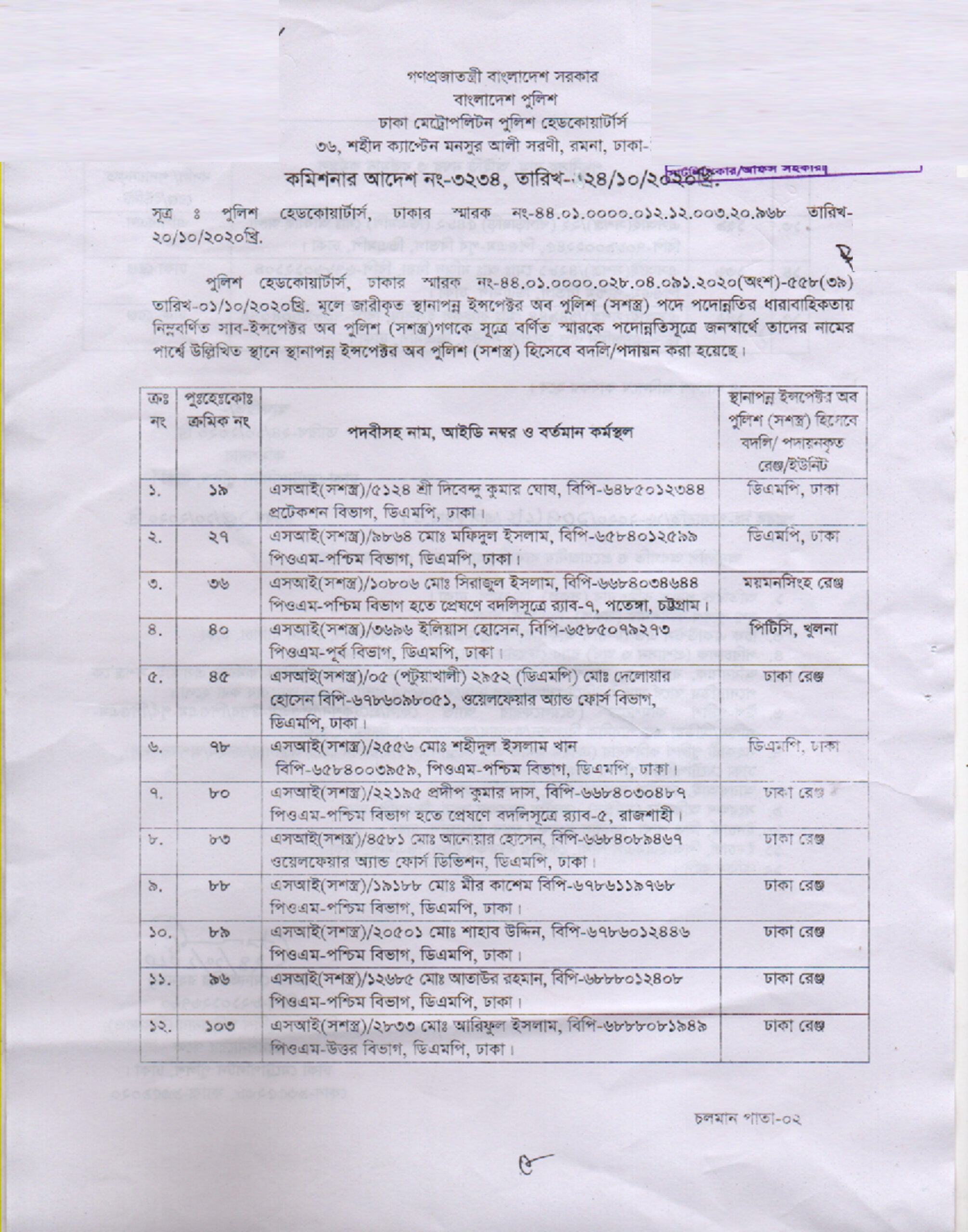শনিবার (২৪ অক্টোবর) ডিএমপি কমিশনার মোহাঃ শফিকুল ইসলাম বিপিএম (বার) স্বাক্ষরিত এক অফিস আদেশে এ তথ্য জানানো হয়।