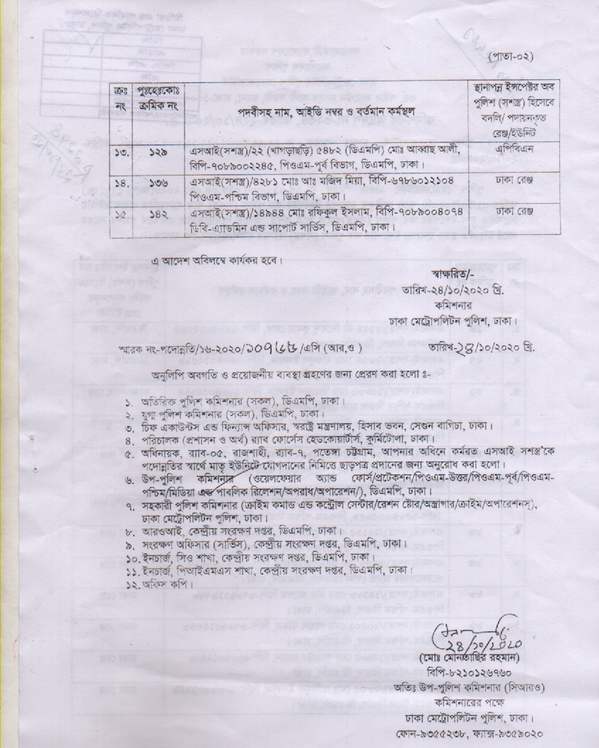 ডিএমপির পদোন্নতিপ্রাপ্ত ১৫ পুলিশ পরিদর্শক বদলি(তালিকাসহ)
