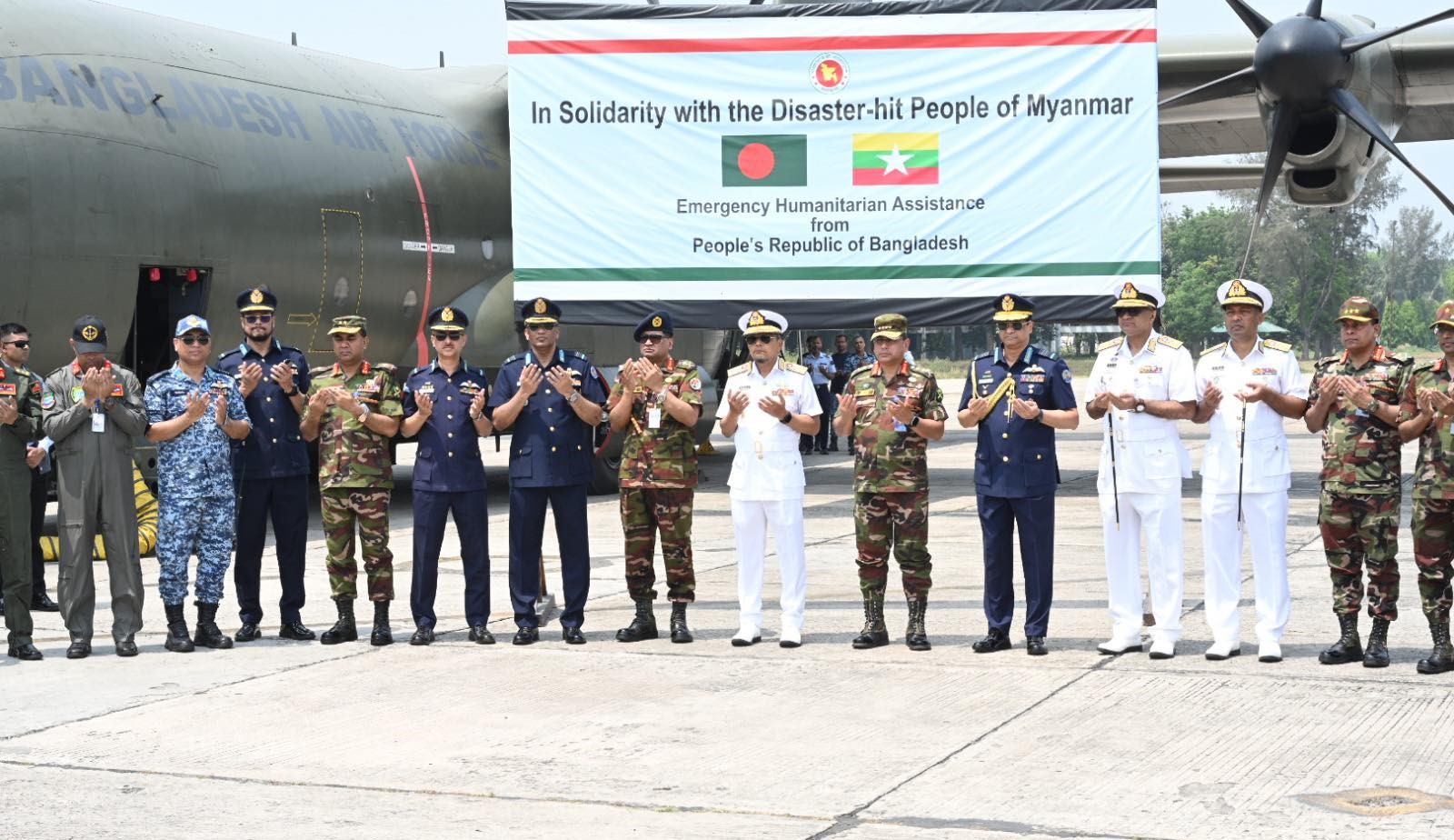 প্রাথমিকভাবে আজ (৩০ মার্চ) দুপুর সাড়ে ১২টায় ঘটিকায় বাংলাদেশ বিমান বাহিনী ঘাঁটি কুর্মিটোলা থেকে বিমান বাহিনীর ০১টি সি-১৩০জে বিমান এবং আর্মি এভিয়েশনের ০১টি কাসা সি-২৯৫ডব্লিউ বিমান জরুরী ত্রাণ সামগ্রীসহ মিয়ানমারের ইয়াংগুন এর উদ্দেশ্যে রওনা করেছে।