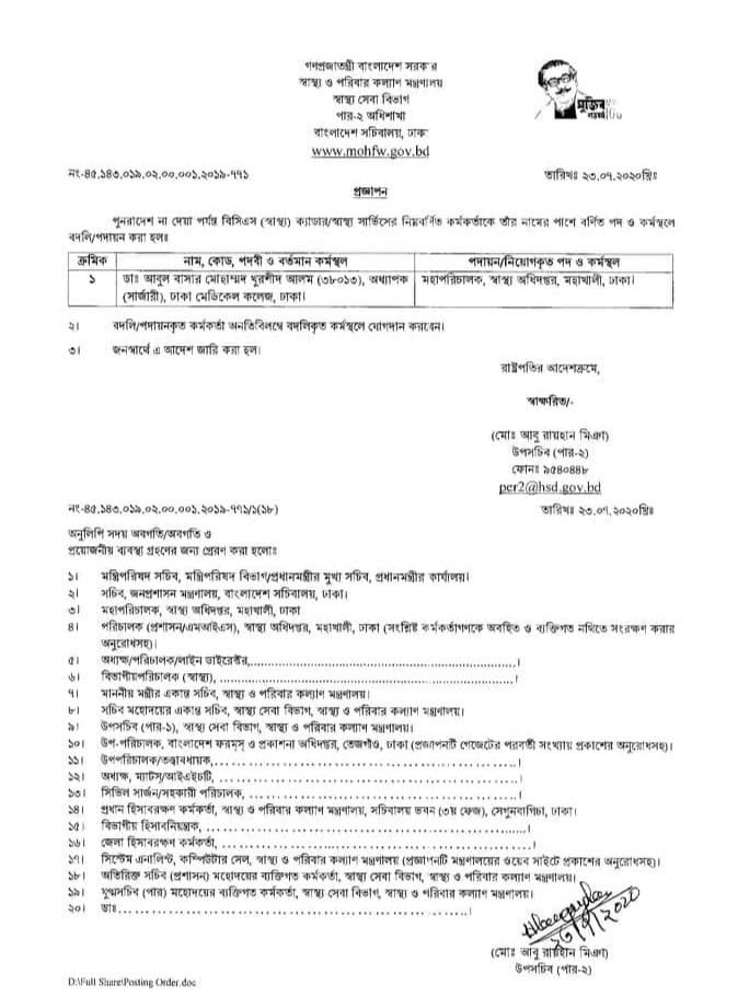 এই নিয়োগ দিয়ে বৃহস্পতিবার (২৩ জুলাই) স্বাস্থ্য মন্ত্রণালয়ের স্বাস্থ্য সেবা বিভাগ থেকে আদেশ জারি করা হয়েছে।