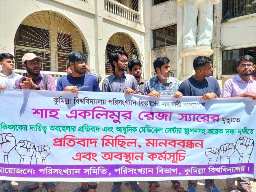 কুবি প্রতিনিধি : পরিসংখ্যান বিভাগের সহকারী অধ্যাপক শাহ একলিমুর রেজার মৃত্যুতে চিকিৎসকের অবহেলার প্রতিবাদ, আধুনিক মেডিকেল সেন্টার স্থাপনসহ মোট ৬ দফা দাবিতে প্রতিবাদ মিছিল, মানববন্ধন ও অবস্থান কর্মসূচি পালন করেছে কুমিল্লা বিশ্ববিদ্যালয়ের (কুবি) পরিসংখ্যান বিভাগের শিক্ষার্থীরা।