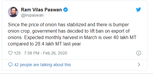 বুধবার টুইটে তিনি বলেন, যেহেতু পেঁয়াজের দাম এখন স্থিতিশীল এবং বাম্পার ফলন হয়েছে তাই সরকার পেঁয়াজ রপ্তানির ওপর নিষেধাজ্ঞা উঠিয়ে নেওয়ার সিদ্ধান্ত নিয়েছে।