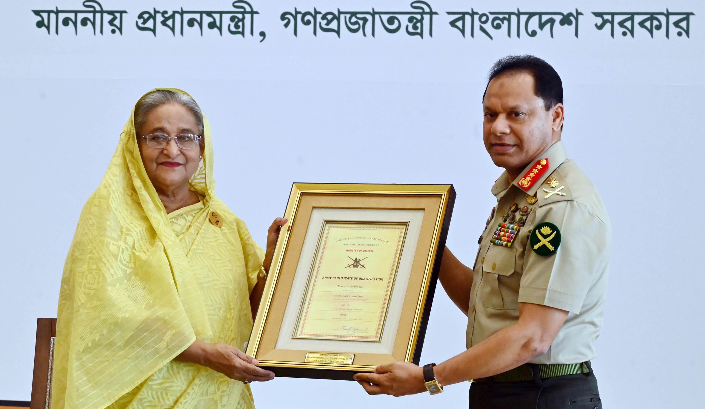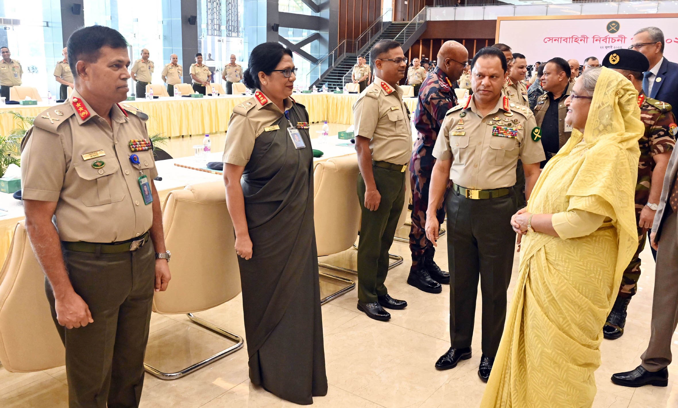 আইএসপিআরের এক প্রেস বিজ্ঞপ্তিতে জানানো হয়, এর আগে প্রধানমন্ত্রী অনুষ্ঠানে পৌঁছলে নিরাপত্তা বিষয়ক উপদেষ্টা মেজর জেনারেল (অব.) তারেক আহমেদ সিদ্দিক এবং সেনাপ্রধান জেনারেল এস এম শফিউদ্দিন আহমেদ তাঁকে স্বাগত জানান।-বাসস