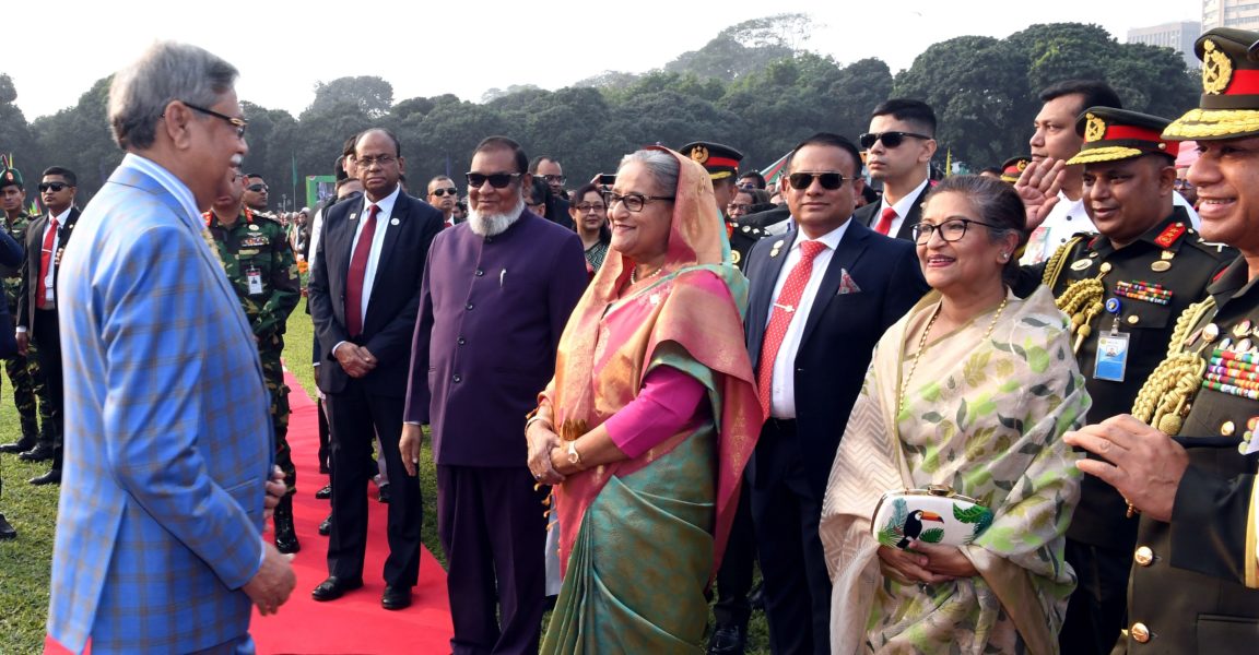 বাংলাদেশের ৫৩তম বিজয় দিবস উপলক্ষে বঙ্গভবনের সবুজ লনে আয়োজিত সংবর্ধনায় প্রধানমন্ত্রী শেখ হাসিনা এবং তাঁর ছোট বোন শেখ রেহানা যোগ দেন।