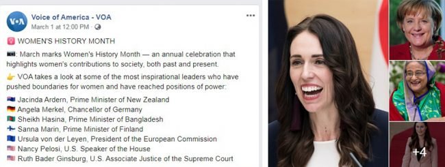 নারীদের জন্য বিশেষ এই মাসকে ঘিরে ফেসবুকে একটি পোস্ট দিয়েছে মার্কিন সংবাদমাধ্যম ভয়েস অব আমেরিকা (ভোয়া)। পোস্টে তারা আপন ক্ষেত্রে প্রভাবশালী বিশ্বের ৭ নারী রাজনীতিকের নাম উল্লেখ করেছে। এ তালিকায় ৩য় অবস্থানে রয়েছেন বাংলাদেশের প্রধানমন্ত্রী শেখ হাসিনা। ১ম স্থানে রয়েছেন নিউজিল্যান্ডের প্রধানমন্ত্রী জাসিন্ডা আরডার্ন।