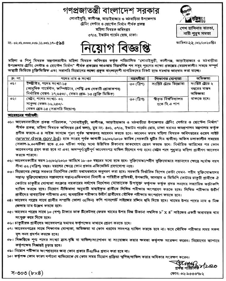 আবেদনের ঠিকানা: প্রার্থীকে প্রকল্প পরিচালক, “সোনাইমুড়ী, কালীগঞ্জ, আড়াইহাজার ও মঠবাড়ীয়া উপজেলায় ট্রেনিং সেন্টার ও হোস্টেল নির্মাণ” শীর্ষক প্রকল্প, মহিলা বিষয়ক অধিদপ্তর (৪র্থ তলা), রুম নং-৪০১, ৩৭/৩, ইস্কাটন গার্ডেন রোড, ঢাকা বরাবর আবেদন করতে হবে।