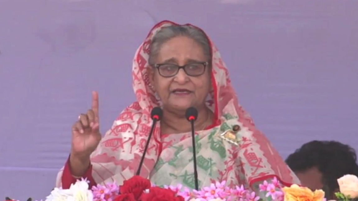 জুমবাংলা ডেস্ক : রংপুরের মিঠাপুকুরে নির্বাচনী জনসভায় বক্তব্য দিচ্ছেন প্রধানমন্ত্রী শেখ হাসিনা।