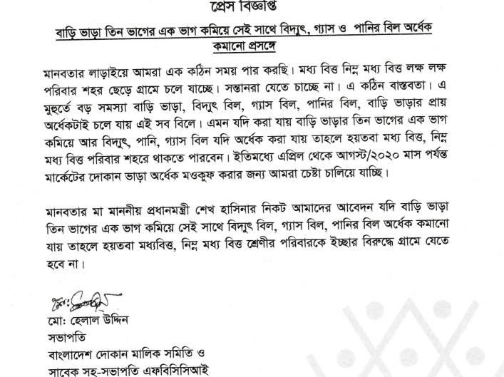বিজ্ঞপ্তিতে দোকান মালিক সমিতির সভাপতি বলেন, মানবতার লড়াইয়ে আমরা এক কঠিন সময় পার করছি। মধ্যবিত্ত, নিম্ন মধ্যবিত্ত লক্ষ লক্ষ পরিবার শহর ছেড়ে গ্রামে চলে যাচ্ছে। এ মুহুর্তে বড় সমস্যা বাড়ি ভাড়া, বিদ্যুৎ বিল, গ্যাস বিল, পানির বিল বাড়ি ভাড়ার প্রায় অর্ধেকটাই চলে যায় এই সব বিলে। বাড়ি ভাড়ার তিন ভাগের এক ভাগ কমিয়ে আর বিদ্যুৎ, পানি, গ্যাস বিল যদি অর্ধেক করা যায় তাহলে হয়তবা মধ্যবিত্ত, নিম্ন মধ্যবিত্ত পরিবার শহরে থাকতে পারবেন।