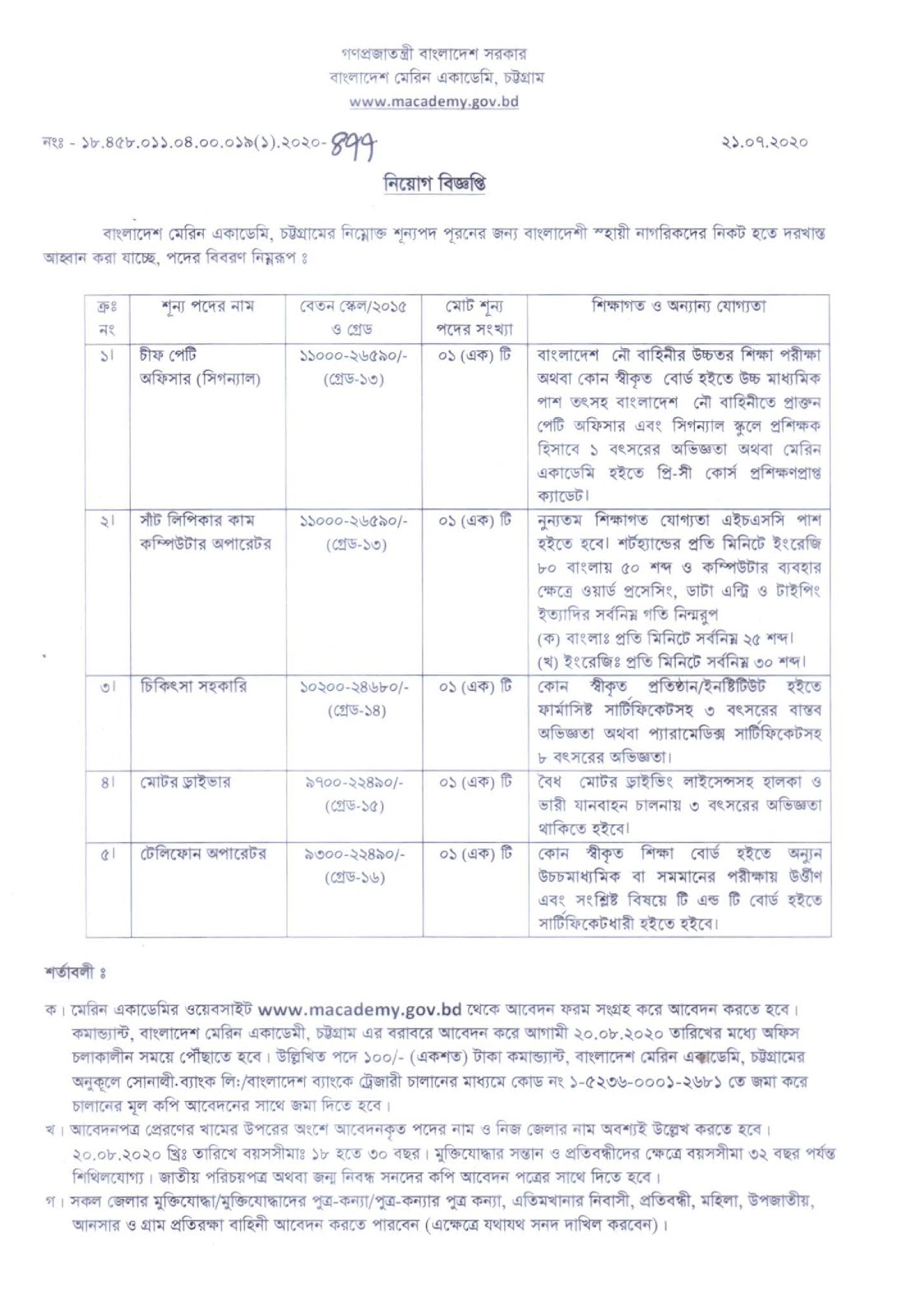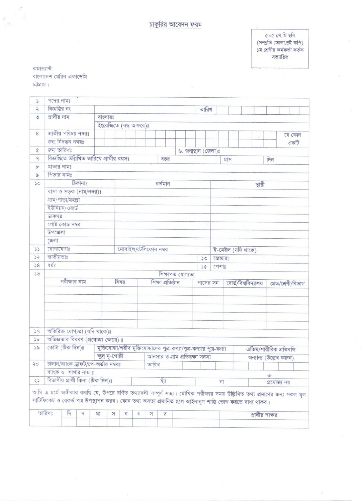 আবেদন ঠিকানা: আগ্রহী প্রার্থীরা আবেদনপত্র পূরণ করে কমান্ড্যান্ট, বাংলাদেশ মেরিন একাডেমী, চট্টগ্রাম এর বরাবর পাঠাতে হবে।