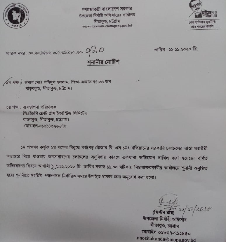 এদিকে এলাকাবাসীর অভিযোগের পর গত ১১ নভেম্বর সীতাকুণ্ড উপজেলা নির্বাহী কর্মকর্তা শুনানির জন্য নোটিশ দেন পিএইচপি ফ্লোট গ্লাস ইন্ডাস্ট্রিজের ব্যবস্থাপনা পরিচালক আমির হোসেন সোহেল এবং অভিযোগকারী শহীদুল ইসলামসহ অন্যান্যদের। পরবর্তীতে ১৬ নভেম্বর শুনানি শেষে সিদ্ধান্ত হয় সার্ভেয়ার নিয়োগের মাধ্যমে সড়কের জায়গা চিহ্নিত করে সেটি উদ্ধার করা হবে। তবে এরপর গত ১৫ দিনেও বিষয়টি নিয়ে কোনো অগ্রগতি হয়নি।