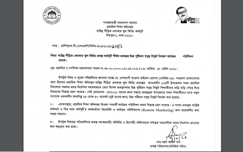 দারিদ্র্য পীড়িত এলাকায় স্কুল ফিডিং প্রকল্পের পরিচালক মো. রুহুল আমিন খান স্বাক্ষরিত চিঠিতে বলা হয়েছে, গত ১০ জুন দারিদ্র্য পীড়িত এলাকায় স্কুল ফিডিং প্রকল্পের ৩০তম স্টিয়ারিং কমিটির সভায় বিদ্যালয় বন্ধ থাকায় এনজিও কর্মীদের মাধ্যমে প্রকল্পভুক্ত বিদ্যালয়ের শিক্ষার্থীদের বাড়ি বাড়ি উচ্চ পুষ্টিমান সমৃদ্ধ বিস্কুট এবং ১৬টি উপজেলার শিক্ষার্থীদের জন্য সংগৃহীত ও মওজুদকৃত মিড ডে মিলের চাল, ভাল এবং ভোজ্য তেল সংশ্লিষ্ট উপজেলা নির্বাহী অফিসার ও উপজেলা শিক্ষা অফিসার পরস্পরের সাথে সমন্বয় করে এনজিও কর্মীদের মাধ্যমে শিক্ষার্থীদের অভিভাবকদের মাঝে বিতরণের ব্যবস্থা করবেন বলে সিদ্ধান্ত নেয়া হয়েছে।