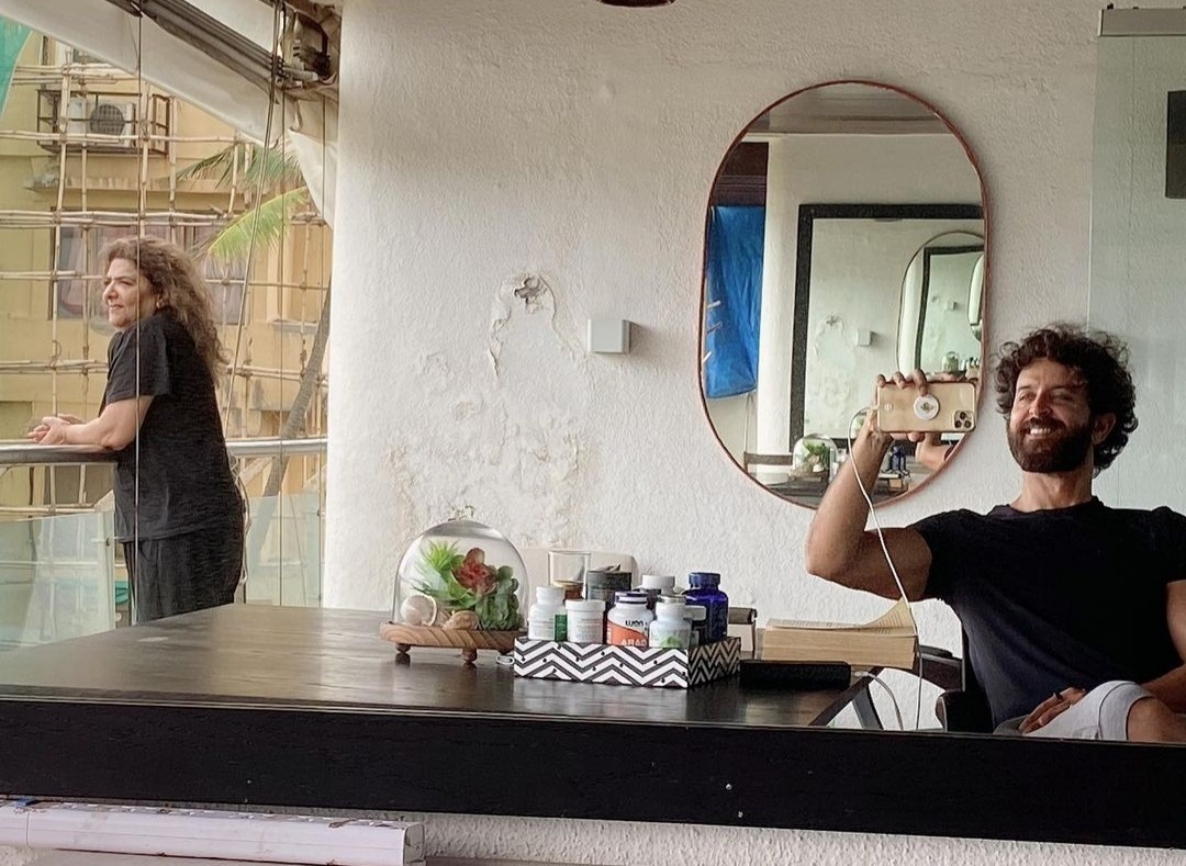 ছবিটিতে দেখা যায়, হৃতিকের মা বারান্দায় দাঁড়িয়ে আছেন, আর তার পেছনে বড় একটি আয়না। কিন্তু কয়েকজন ভক্তের চোখ আটকে যায় ওঠা স্যাঁতসেঁতে দেওয়ালে।