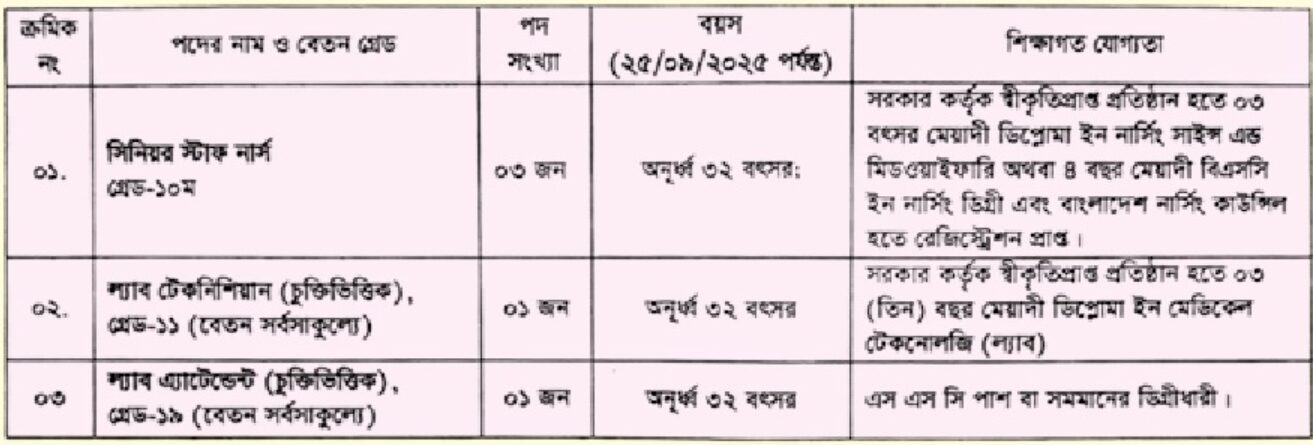 বয়স: ২৫ সেপ্টেম্বর ২০২৫ তারিখ সর্বোচ্চ ৩২ বছর। বয়স প্রমাণের ক্ষেত্রে কোনো প্রকার এফিডেভিট গ্রহণযোগ্য হবে না।