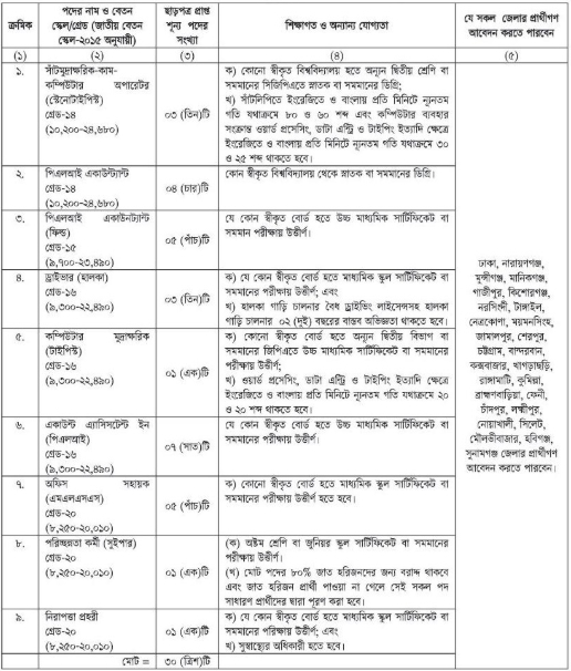 বয়স: ০১ মার্চ ২০২৫ তারিখে ১৮-৩২ বছর। বয়স প্রমাণের ক্ষেত্রে এসএসসি/সমমান/জন্মনিবন্ধন/এনআইডি কার্ডের তারিখ বিবেচিত হবে।