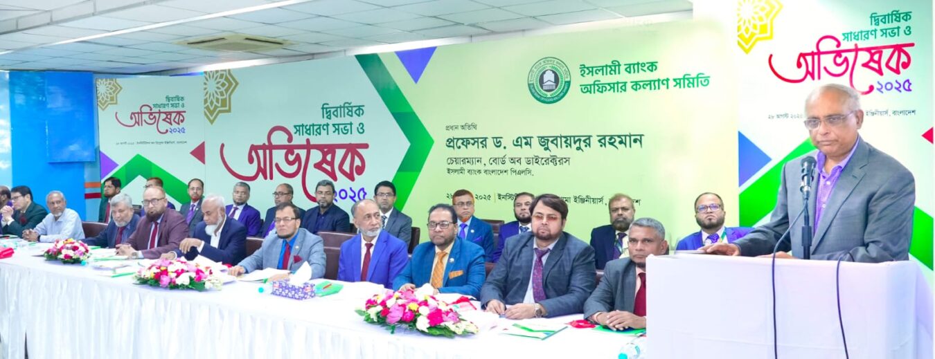 ইসলামী ব্যাংক অফিসার কল্যাণ সমিতির দ্বিবার্ষিক সাধারণ সভা ও অভিষেক অনুষ্ঠান বৃহস্পতিবার (২৮ আগস্ট) রাজধানীর ইনস্টিটিউশন অব ডিপ্লোমা ইঞ্জিনিয়ার্স, বাংলাদেশ মিলনায়তনে অনুষ্ঠিত হয়েছে। অনুষ্ঠানে প্রধান অতিথি হিসেবে বক্তব্য দেন ইসলামী ব্যাংক বাংলাদেশ পিএলসি’র চেয়ারম্যান প্রফেসর ড. এম জুবায়দুর রহমান। ব্যাংকের ম্যানেজিং ডাইরেক্টর মোঃ ওমর ফারুক খাঁন-এর সভাপতিত্বে বিশেষ অতিথি হিসেবে বক্তব্য দেন ব্যাংকের অডিট কমিটির চেয়ারম্যান মোঃ আবদুস সালাম, এফসিএ, এফসিএস। উপদেষ্টা মন্ডলীদের পক্ষ থেকে বক্তব্য দেন অ্যাডিশনাল ম্যানেজিং ডাইরেক্টর মোঃ আলতাফ হুসাইন ও মোহাম্মদ জামাল উদ্দিন মজুমদার। অনুষ্ঠানে আরও বক্তব্য দেন ব্যাংকের সাবেক ডেপুটি ম্যানেজিং ডাইরেক্টর এবং সমিতির সাবেক সভাপতি ইঞ্জিনিয়ার আবুল বাশার ও মোঃ মোশাররফ হোসাইন, সমিতির সদ্য…
