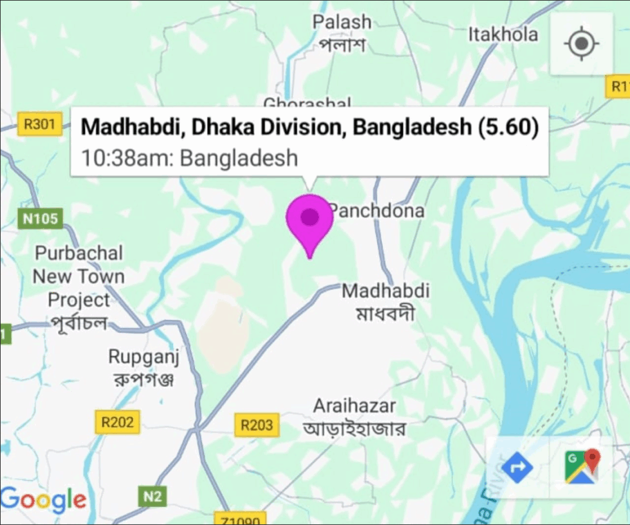 রাজধানী ঢাকাসহ দেশের বিভিন্ন এলাকায় আজ (২১ নভেম্বর) ভূমিকম্প অনুভূত হয়েছে। বাংলাদেশ আবহাওয়া অধিদপ্তরের তথ্য অনুযায়ী সকাল ১০টা ৩৮ মিনিট ২৬ সেকেন্ডে ভূমিকম্প অনুভূত হয়েছে। রিখটার স্কেলে এর মাত্রা ছিল ৫.৭। এর উৎপত্তিস্থল ছিল নরসিংদীর মাধবদী এবং ঢাকার আগারগাঁও এর আবহাওয়া অধিদপ্তরের সিসমিক সেন্টার হতে ১৩ কিলোমিটার পূর্বে। এর লোকেশন ছিল Lat.: 23.77°N, Long.: 90.51°E (Madhabdi, Dhaka).