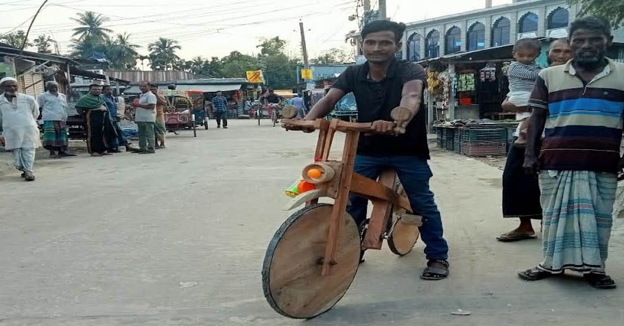 জুমবাংলা ডেস্ক: কিশোরগঞ্জ জেলার তাড়াইলে কাঠের বাইসাইকেল তৈরি করে তাক লাগিয়েছেন সোহাগ নামে এক যুবক। তিনি পেশায় একজন কাঠমিস্ত্রি। কাজের ফাঁকে-ফাঁকে এই ব্যতিক্রমী বাইসাইকেল তৈরি করেন তিনি। তাড়াইল উপজেলার দড়িজাহাঙ্গীরপুর গ্রামের মুসলিম উদ্দিনের ছেলে। গতকাল বিকেলে সোহাগ তার কাঠের বাইসাইকেল চালিয়ে কিশোরগঞ্জ সদর কলাপাড়া মোড়ে আসলে উৎসুক জনতা সাইকেলটি দেখতে ভিড় জমায়। বাইসাইকেল হলেও এটি দেখতে অনেকটা মোটরসাইকেলের মতো। কাঠমিস্ত্রি সোহাগ জানান, কাঠমিস্ত্রী কাজ বেশি থাকার কারণে প্রতিদিন কাজের ফাঁকে-ফাঁকে এই সাইকেলটি তৈরি করেছেন।