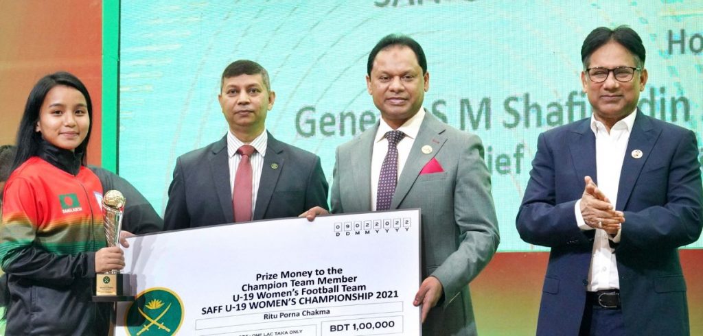 স্পোর্টস ডেস্ক: সাফ অনুর্ধ্ব-১৯ ফুটবল চ্যাম্পিয়নশীপে শিরোপা জয়ী বাংলাদেশ অনুর্ধ্ব-১৯ নারী ফুটবল দল ও সংশ্লিষ্ট সকলকে বুধবার (৯ ফেব্রয়ারি) বাংলাদেশ সেনাবাহিনীর পক্ষ থেকে সেনাবাহিনী প্রধান জেনারেল এস এম শফিউদ্দিন আহমেদ কর্তৃক উষ্ণ সংবর্ধনা প্রদান করা হয়। ঢাকা সেনানিবাসস্থ আর্মি মাল্টিপারপাস কমপ্লেক্সে এই সংবর্ধনা অনুষ্ঠান আয়োজন করা হয়। সেনাবাহিনী প্রধান অনুষ্ঠানে প্রধান অতিথি হিসেবে উপস্থিত থেকে বাংলাদেশ অনুর্ধ্ব-১৯ নারী দলের প্রতি খেলোয়াড়কে এক লক্ষ টাকার চেক এবং পুরস্কার প্রদান করেন। এছাড়াও, সংশ্লিষ্ট অফিসিয়ালদের মাঝে পুরস্কার বিতরণ করা হয়। পুরস্কার বিতরণ শেষে উপস্থিত সকলের জন্য নৈশ ভোজের আয়োজন করা হয়। অনুষ্ঠানে সেনাসদরের প্রিন্সিপাল স্টাফ অফিসারবৃন্দ, সেনাবাহিনীর এবং বাংলাদেশ ফুটবল ফেডারেশনের উচ্চপদস্থ কর্মকর্তা…