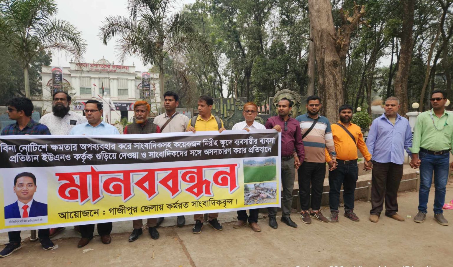 নিজস্ব প্রতিবেদক, গাজীপুর: বিনানোটিশে সাংবাদিকের ঔষধের ফার্মসী গুঁড়িয়ে দেওয়ার প্রতিবাদে ইউএনও’র বিরুদ্ধে মানববন্ধন করেছেন গাজীপুর ও কালিয়াকৈরের বিভিন্ন প্রিন্ট ও ইলেকট্রনিক্স মিডিয়া সাংবাদিকবৃন্দ। বৃহস্পতিবার (২২ ফেব্রুয়ারি) দুপুরে গাজীপুর জেলা প্রশাসকের কার্যালয়ের সামনে এ মানববন্ধন করেন স্থানীয় সাংবাদিকর। কালিয়াকৈর মডেল প্রেসক্লাবের সাধারণ সম্পাদক হুমায়ুন কবিরের সঞ্চালনায় মানববন্ধনে বক্তব্য রাখেন গাজীপুর প্রেসক্লাবের সাধারণ সম্পাদক মাহতাব উদ্দিন, সহ-সভাপতি ফরিদ উদ্দিন, যমুনা টেলিভিশনের গাজীপুর জেলা প্রতিনিধি হোসাইন আলী বাবু , নাগরিক টেলিভিশনের গাজীপুর জেলা প্রতিনিধি আল-আমিন, দীপ্ত টেলিভিশনের গাজীপুর জেলা প্রতিনিধি জাহাঙ্গীর আলম, আনন্দ টেলিভিশনের কালিয়াকৈর উপজেলা প্রতিনিধি আফসার খান বিপুল, কালিয়াকৈর মডেল প্রেসক্লাবে সহ-সভাপতি মোশাররফ হোসেন ও কালিয়াকৈর মডেল প্রেসক্লাবের সভাপতি ভুক্তভোগী সাংবাদিক…