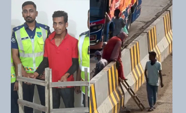 জুমবাংলা ডেস্ক : ঢাকা-চট্টগ্রাম মহাসড়কে নারায়ণগঞ্জের সিদ্ধিরগঞ্জ অংশে মই দিয়ে ডিভাইডার পার করে যাত্রীদের কাছ থেকে টাকা আদায় করা সেই যুবককে আটক করেছে হাইওয়ে পুলিশ। আটককৃত যুবকের নাম রবিউল (২৬)। সে চট্টগ্রাম জেলার মিরসরাই থানার আলতাব হোসেনের ছেলে। রবিবার (১৭ মার্চ) রাতে আটকের বিষয়টি নিশ্চিত করেছেন কাঁচপুর হাইওয়ে শিমরাইল ক্যাম্পের ইনচার্জ একে এম শরিফউদ্দিন। তিনি বলেন, আটককৃত ব্যক্তি বেআইনিভাবে মহাসড়কে বিপদগ্রস্ত মানুষের কাছ থেকে পারাপার বাবদ অর্থ আদায় করেছিল। বিভিন্ন গণমাধ্যম কর্মীও সাধারণ মানুষের মাধ্যমে আমরা বিষয়টি জানতে পেরে তাকে আটক করি। তার বিরুদ্ধে পরবর্তী আইনানুগ ব্যবস্থা প্রক্রিয়াধীন রয়েছে। উল্লেখ, রবিবার দুপুরে ঢাকা-চট্টগ্রাম মহাসড়কের শিমরাইল মোড়ের সড়ক ও জনপথ অধিদপ্তর অফিসের সামনের…