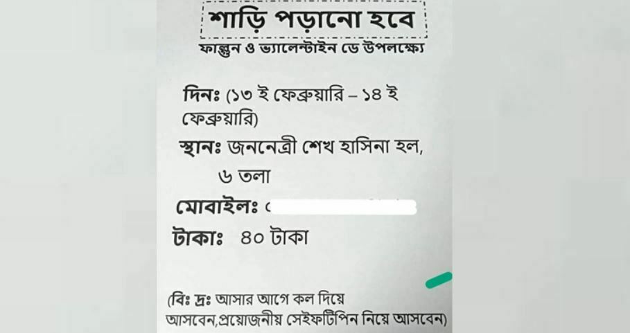 জুমবাংলা ডেস্ক : পহেলা ফাল্গুন ও ভালোবাসা দিবসে চট্টগ্রাম বিশ্ববিদ্যালয়ের (চবি) জননেত্রী শেখ হাসিনা হলে মেয়েদের শাড়ি পরানোর একটি বিজ্ঞাপন…