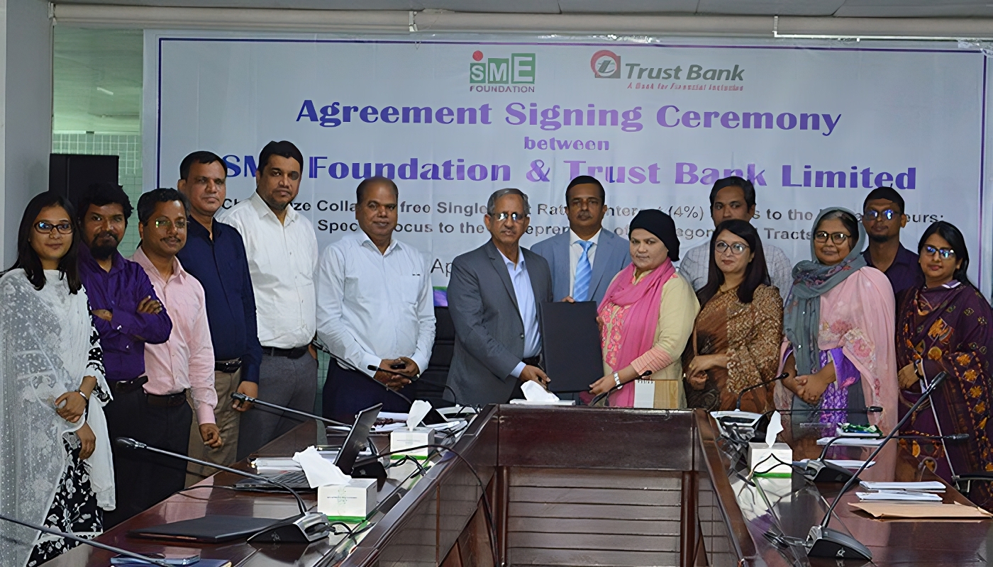 মঙ্গলবার এসএমই ফাউন্ডেশনের সম্মেলন কক্ষে এ বিষয়ে ট্রাস্ট ব্যাংকের সঙ্গে চুক্তি সই করে এসএমই ফাউন্ডেশন। এসএমই ফাউন্ডেশনের পক্ষে ব্যবস্থাপনা পরিচালক ড. মো. মফিজুর রহমান এবং ট্রাস্ট ব্যাংকের পক্ষে ব্যবস্থাপনা পরিচালক হুমায়রা আজম চুক্তিতে সই করেন। এসময় উপস্থিত ছিলেন এসএমই ফাউন্ডেশনের উপ-ব্যবস্থাপনা পরিচালক সালাহ উদ্দিন মাহমুদ এবং মহাব্যবস্থাপক নাজিম হাসান সাত্তার, ফারজানা খান ও মোহাম্মদ জাহাঙ্গীর হোসেন।
